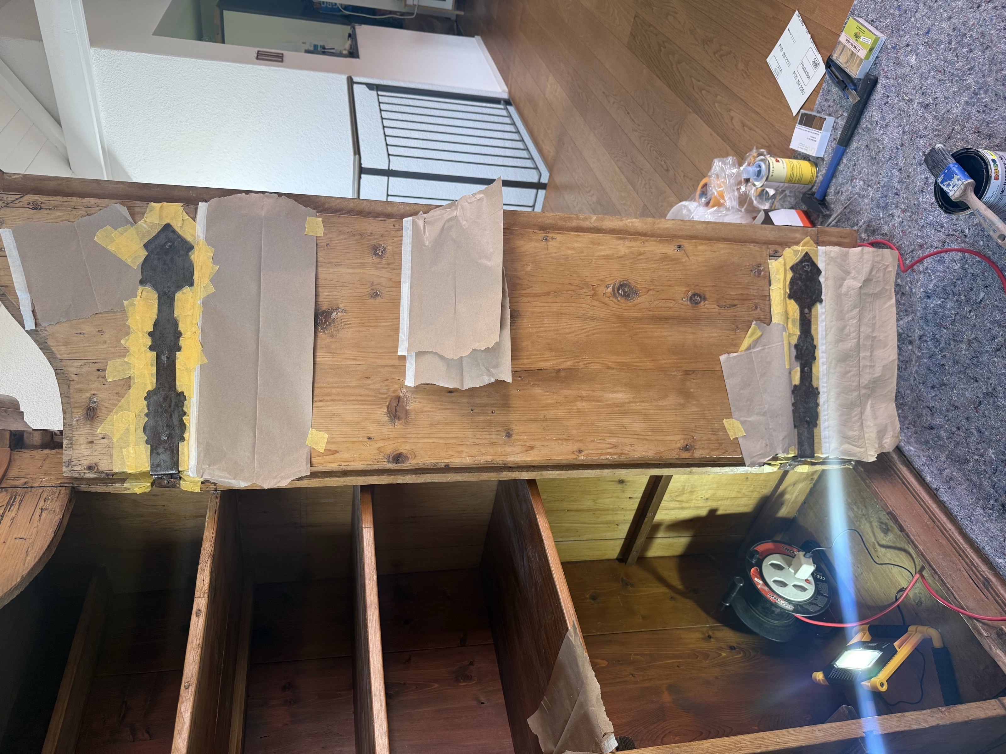 Dieser Schrank hat Generationen überdauert, Narben getragen und unzählige Geschichten bewahrt. Statt ihn zu ersetzen, durfte er bleiben und weiterleben. Schrauben wurden erneuert, morsches Holz ersetzt, Beschläge geschliffen, entfettet und neu mit Hammerschlag veredelt. Jede Spur, jede Kerbe durfte bleiben als Zeugnis seiner Zeit.